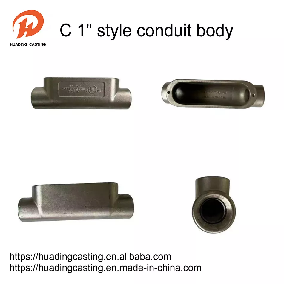 C Style Conduit Body er festet til gjengede stive eller EMT -ledninger når en retningsendring er nødvendig. Avtakbart dekke og pakning gir mulighet for enkel ledning som trekker gjennom. Vanligvis brukt som en økonomisk bekvemmelighetsboks når det er behov for ekstra ledningsplass.